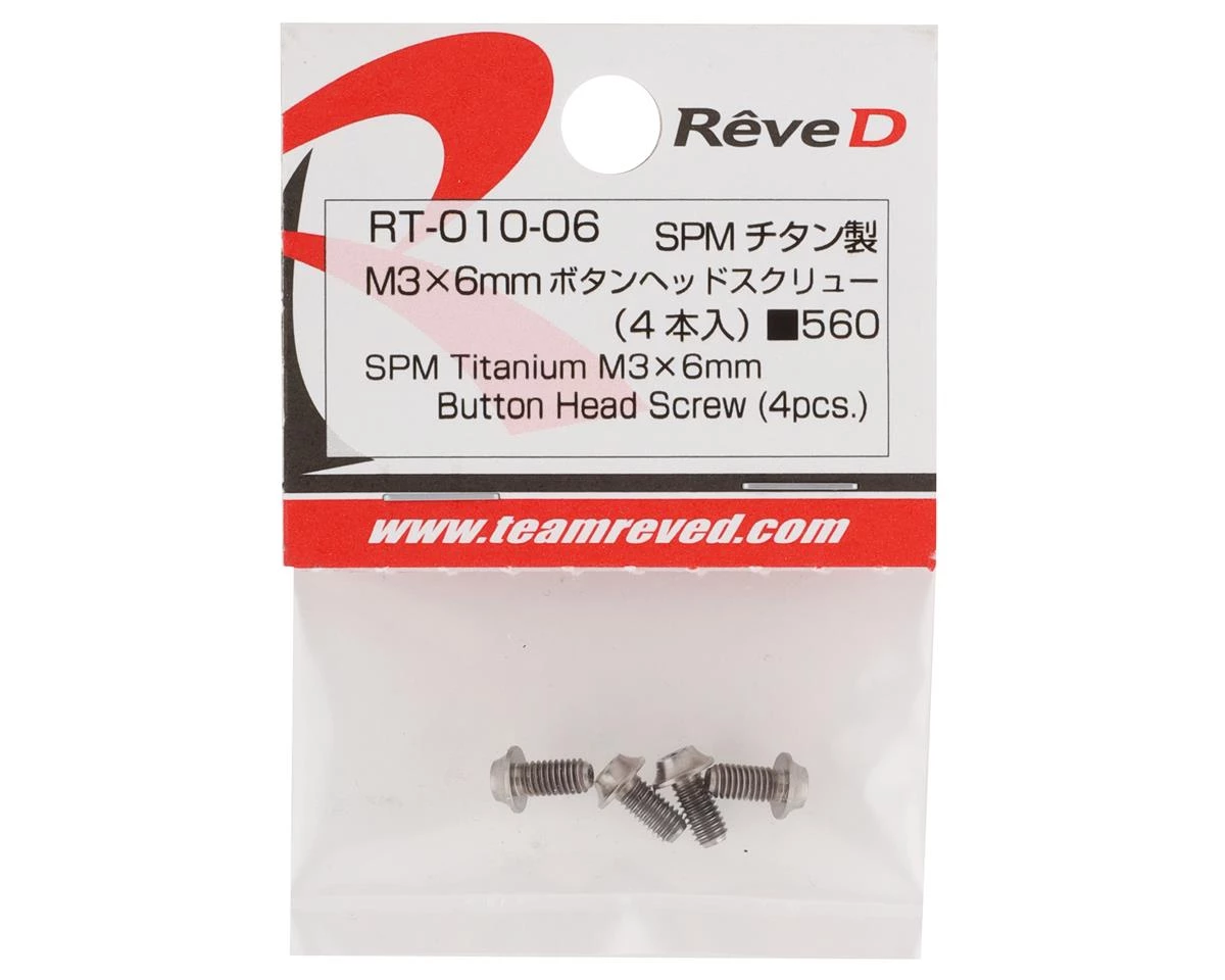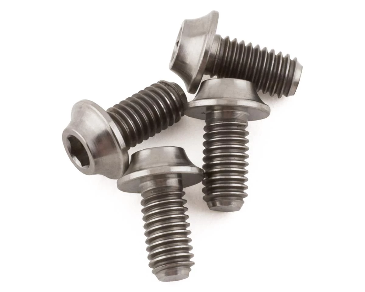A package of four Reve D 3x6mm Titanium Button Head Screws. These screws feature a built in washer that measures 7mm of diameter, which reduces the number of parts and delivers great aesthetics to make your ride stand out from the rest.