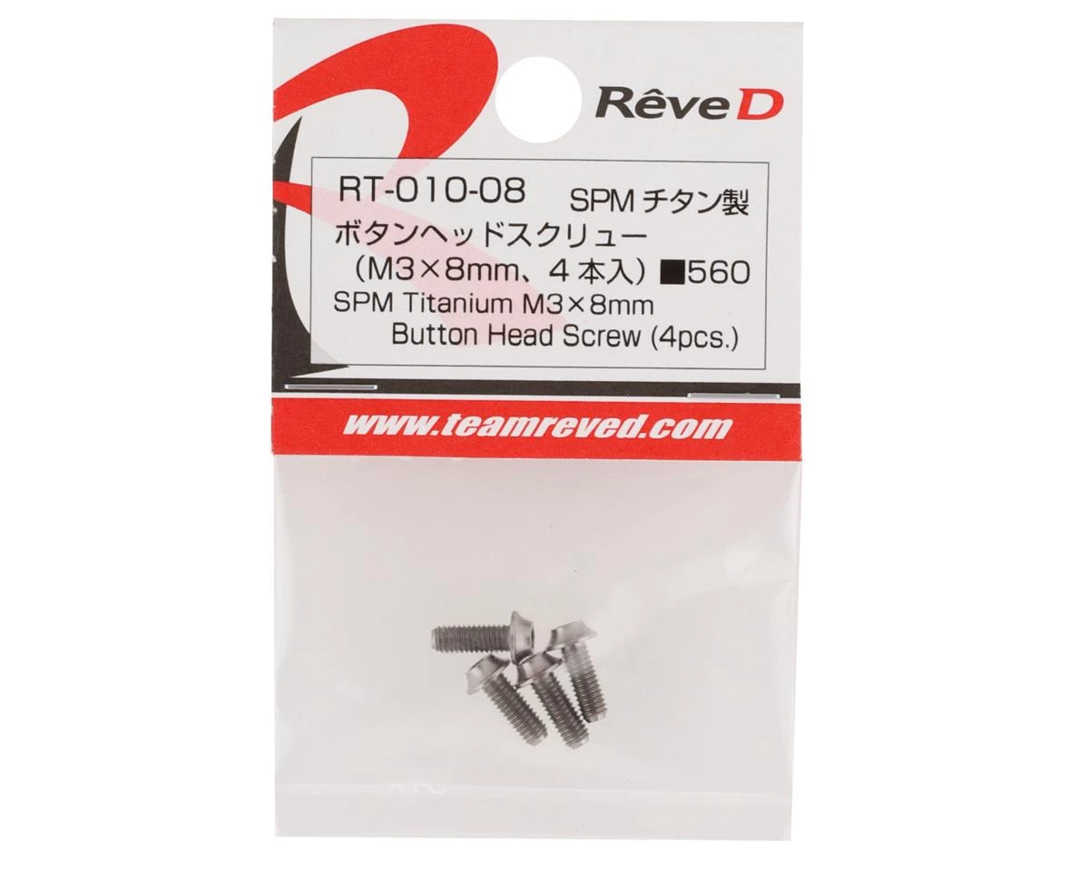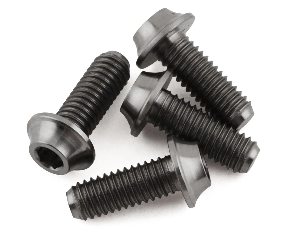 A package of four Reve D 3x8mm Titanium Button Head Screws. These screws feature a built in washer that measures 7mm of diameter, which reduces the number of parts and delivers great aesthetics to make your ride stand out from the rest.