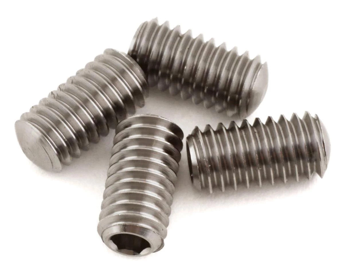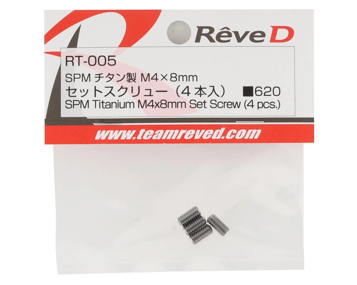 A package of four Reve D 4x8mm SPM Titanium Set Screws.
