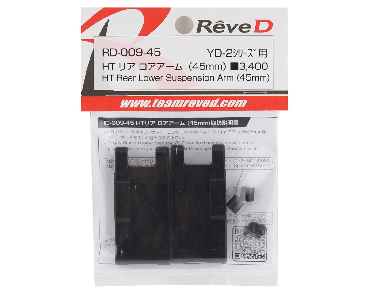 The Reve D HT Rear Lower Suspension Arm Sets are offered in three different lengths, and improve rear traction thanks to the Duracon POM material, shape, and structure.