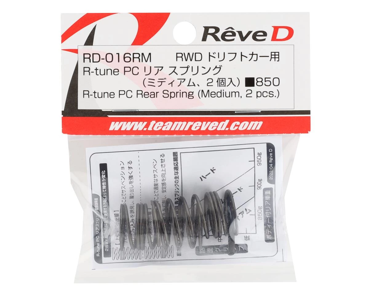This package of Reve D PC “R-Tune” Rear Springs provide you with an additional tuning option for RWD RC drift cars. The PC springs are specifically tuned for low grip conditions, specifically surfaces such as P tile, and colored concrete. R-Tune versions are designed for competition, providing the precision feel experienced and professional drivers need to win competitions.