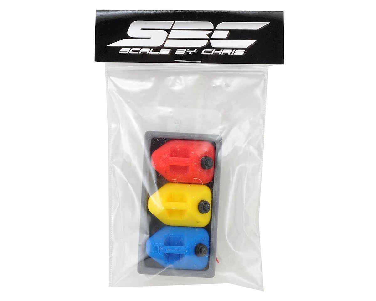 The Scale By Chris 1/2 3 Jugs In Tote includes half size 5 Gallon Fuel Jug, a 5 Gallon Diesel Jug and a 5 Gallon Water Jug, all packed into a tote to easily fit in your rig and keep your liquids safe on the trail. The half size option is perfect for builds that use a half depth cargo area, such as Axial or Pro-Line Jeep bodies, and truck bodies with half depth beds. the complete package measures approximately 37mm deep, 68mm wide and 16mm tall. This is easily secured using a rubberized glue, or by drilling a hole in the bottom and using a screw through the body to hold the tote in place.