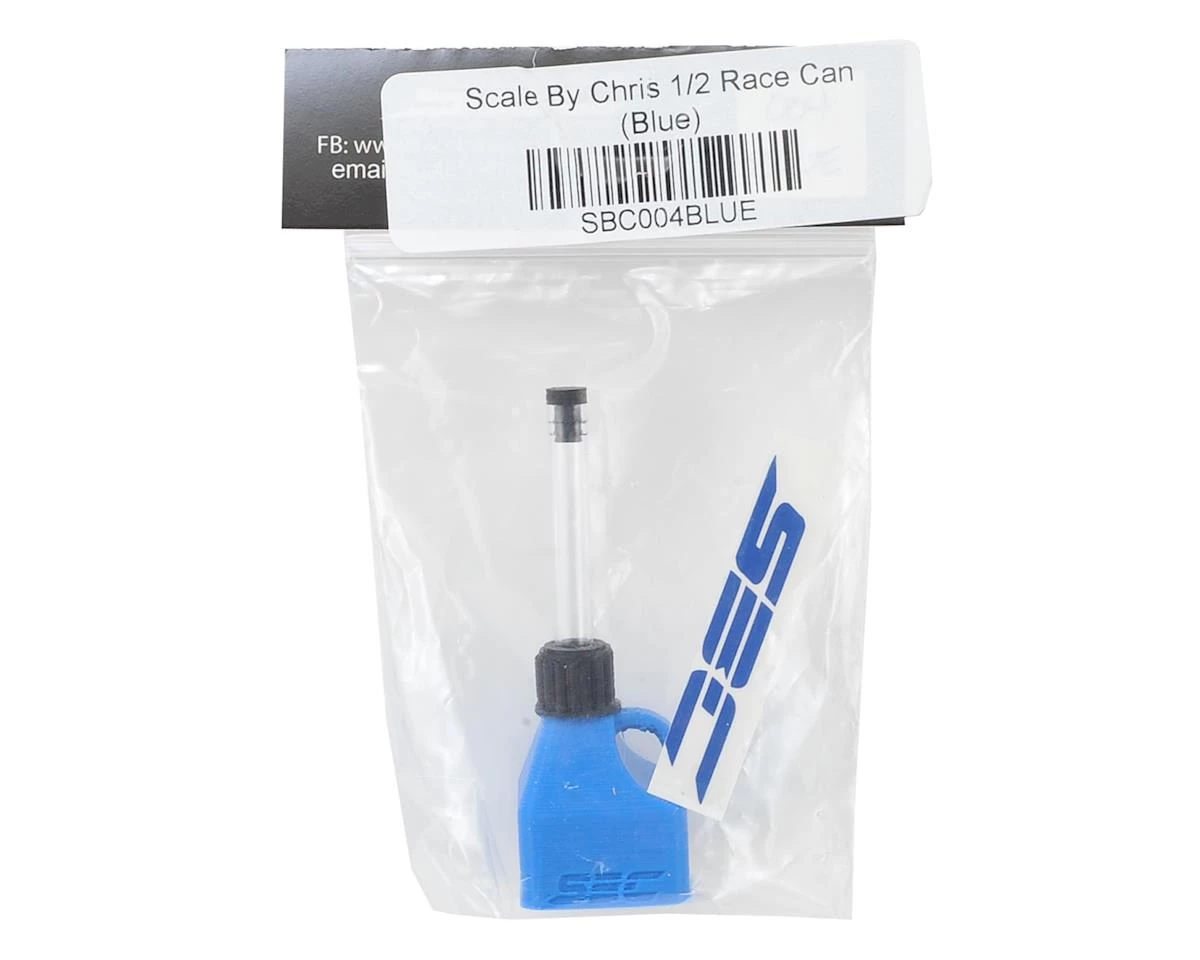 The Scale By Chris 1/2 Race Can is a 3D printed miniaturized replica that adds that perfect finishing touch to your scale build. This blue half size can features a printed handle and lid, with recessed logo and can marking details, as well as a crystal clear fill tube and black fill tube plug. This is perfect for builds that use a half depth cargo area, such as Axial or Pro-Line Jeep bodies, and truck bodies with half depth beds. The can measures approximately 24mm deep, 24mm wide and 35mm tall at the lid (not including filler tube). This can be secured using a rubberized glue, or by drilling a hole in the bottom and using a screw through the body to hold the can in place.
