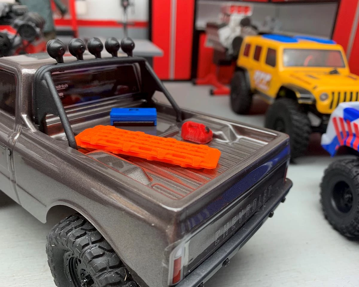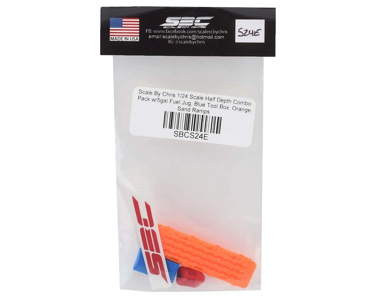 Scale by Chris 1/24 Scale Half Depth Combo Packs are a great way to add micro size detail to your micro size rig. These 1/24 scale half depth items look great and are a great way to accessorize the bed of your truck. Half Depth Combo Pack 1 includes a half depth 5gal Fuel Jug and Blue Tool Box, with full size Orange Sand Ramps.