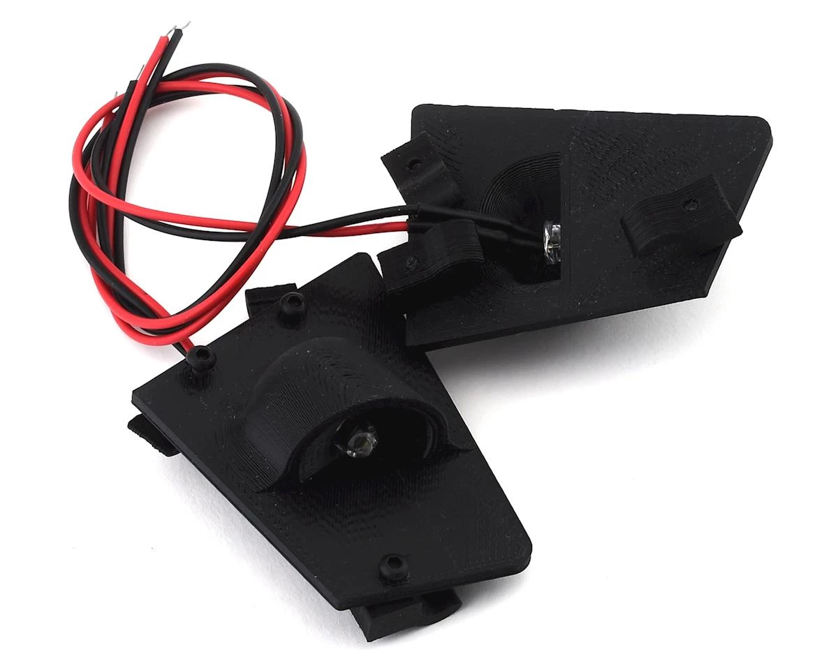 Scale by Chris Gatekeeper Front Filler Panels with Light Buckets include pre-installed 5mm 12V LED lights to make it easy to add another dimension of scale detail. The panel fills the void in the front of the cage at the front bumper to help hide the servo and give the Gatekeeper an improved scale look, while at the same time helping to light up the trail after the sun goes down. The panel features pivoting cage clamps on the back side, holding the panel to the cage securely and making them easy to install. If desired, these can be further detailed using Tamiya TS primer and paint. The wires are left open ended, allowing you to install the connector you prefer.