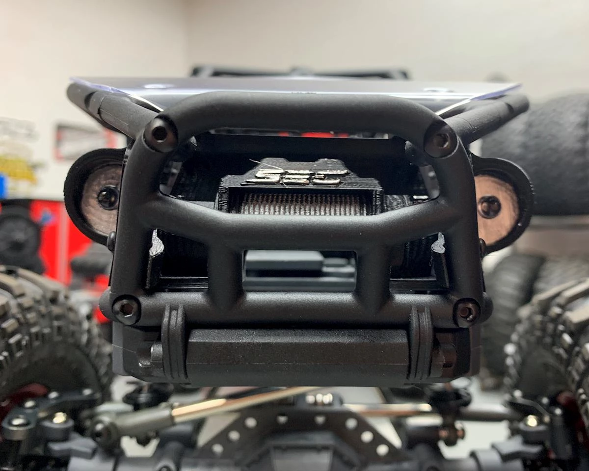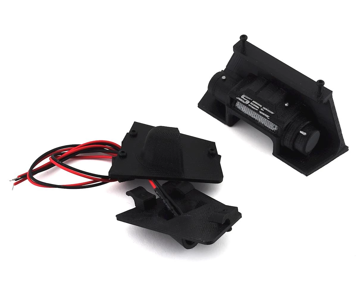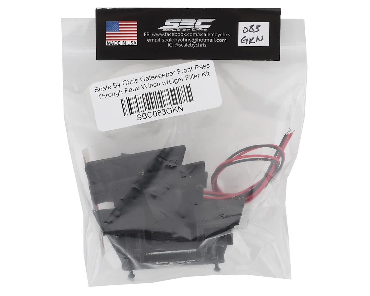 The Scale by Chris Gatekeeper Front Pass Through Faux Winch with Light Bucket Front Filler Panels (SBC083GKL) is a great way to add a realistic look to your build. The pass through winch fills in the area behind the front bumper and still allows the use of an internal servo winch. The front filler panels include pre-installed 5mm 12V LED lights to make it easy to add another dimension of scale detail. The panel fills the void in the front of the cage at the front bumper to help hide the servo and give the Gatekeeper an improved scale look, while at the same time helping to light up the trail after the sun goes down. The panel features pivoting cage clamps on the back side, holding the panel to the cage securely and making them easy to install. If desired, these can be further detailed using Tamiya TS primer and paint. The wires are left open ended, allowing you to install the connector you prefer.