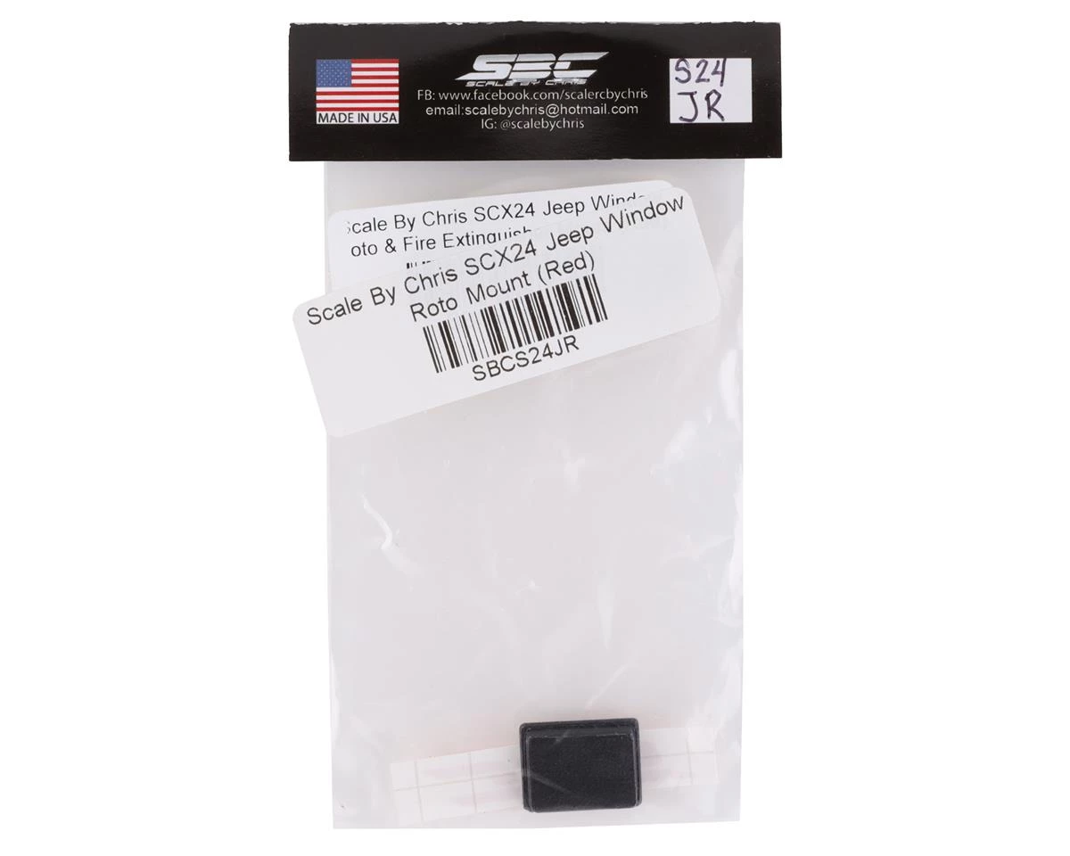 The Scale by Chris SCX24 Jeep Window Roto Mount is a great way to add micro size detail to your SCX24 Jeep. This scale accessory features a single Roto can and installs in either the left or right side window. Simply cut out the window in the side you want to install, slide the Roto Mount in the hole, and use a rubberized adhesive to secure it in place. Package includes one Roto Mount, with preinstalled red roto can.