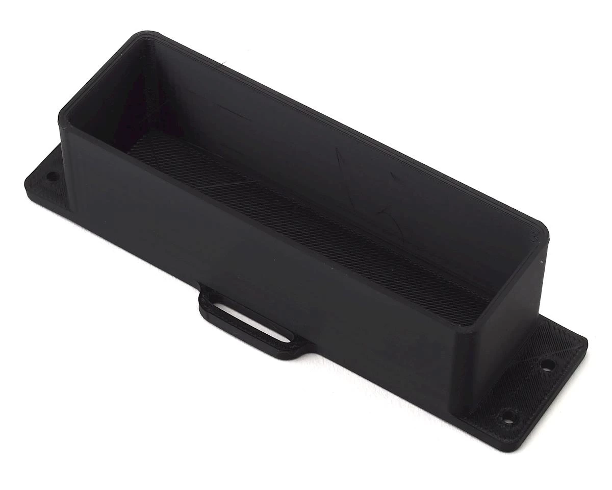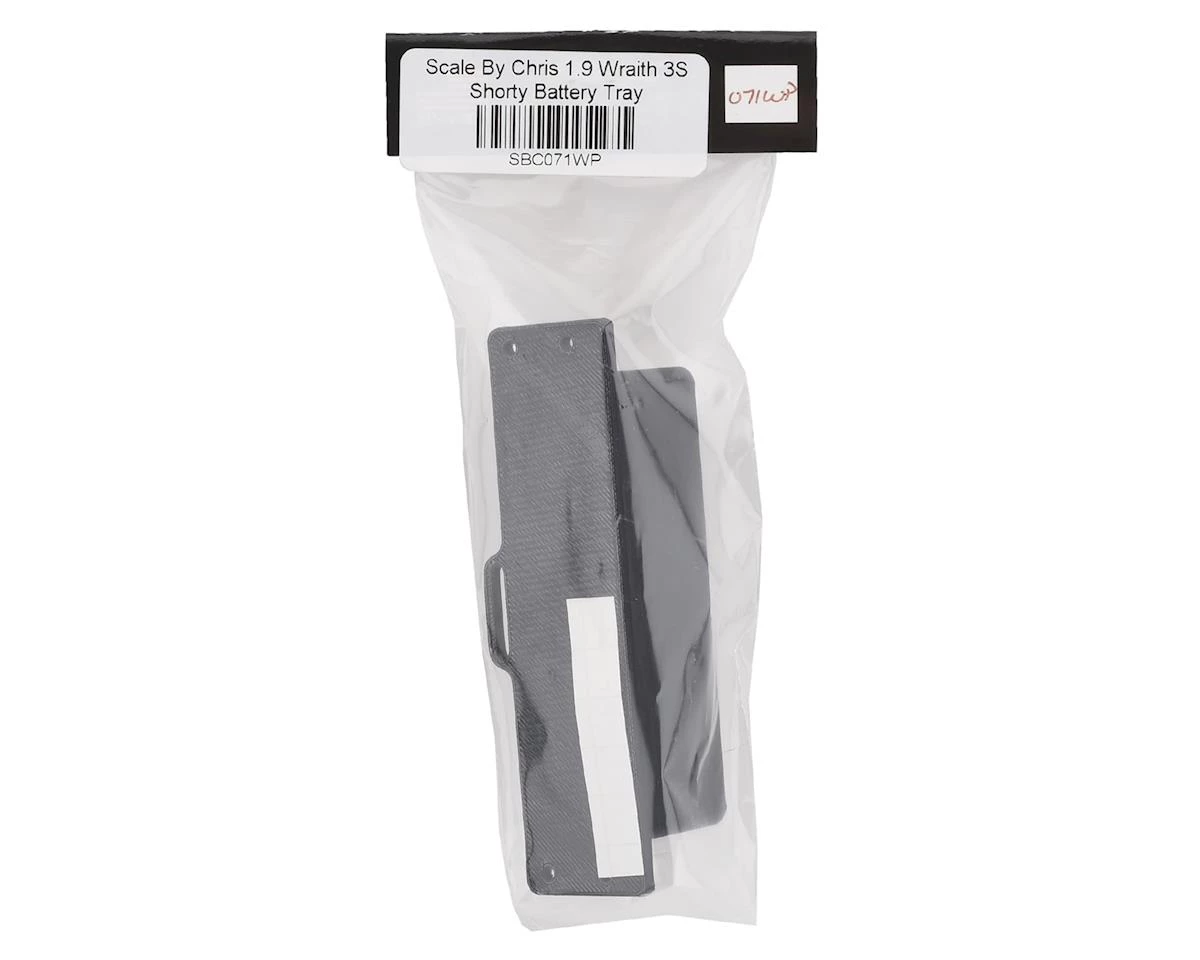 The Scale by Chris 1.9 Wraith 3S Shorty Battery Tray installs into the factory battery tray mounting holes using the stock hardware, and will safely secure any 2S or 3S size shorty back under the hood of the Wraith 1.9. The tray measures 91.8×27.5mm and is 28mm deep.
